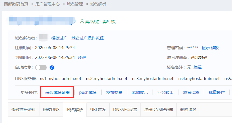 【教程】如何保存或打印出清晰的域名证书一、关于部分客户反馈证书下载后.jpg文件模糊,或打印后不清晰的问题,进行以下说明: 1、建议使用谷歌浏览器,可以保证下载和打印的证书边框完整、保存的文件质量和打印效果佳; 2、若电子档清晰但打印后模糊,是因为图片为了适应纸张大小被放大了比例,需调整打印设置或将证书保存为pdf格式。 二、具体操作步骤如下 1、找到域名,点击域名或管理进入详情,点击 “获取域名证书”
