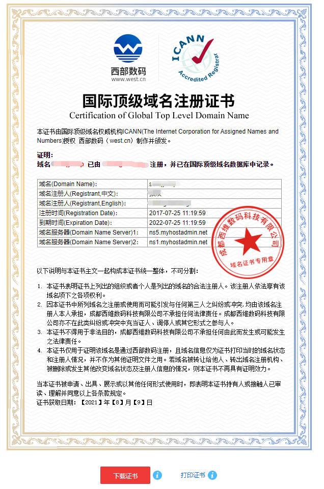 会看到证书样式、注册信息等内容、以及 下载证书 和 打印证书 两个操作。