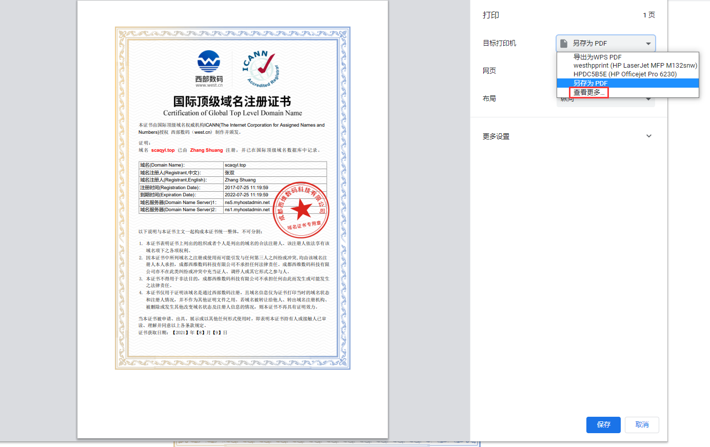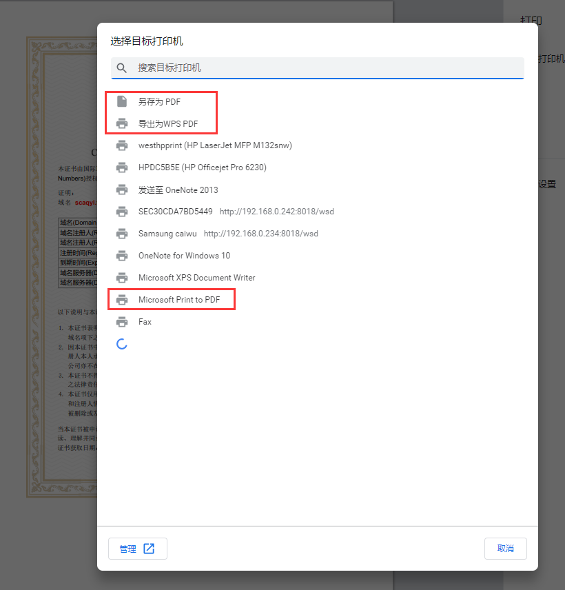 3、因此,若需打印证书,请直接使用“打印证书”功能。 4、若需将证书保存后发送给他人打印,建议按照以下步骤操作: ① 点击“打印证书” ② 点击“目标打印机”,选择“查看更多” ③ 任意选择一个即可:另存为PDF、导出为WPS PDF、Microsoft Print to FDP
